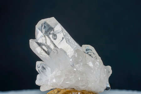 Collection of crystals quartz on dark blue background with shadows. Top view. Copy space