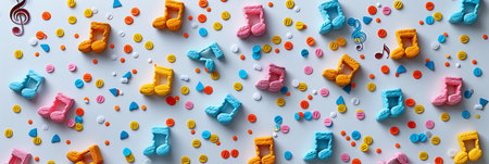 A vibrant arrangement of colorful musical notes and flowing sheet music adds a dynamic touch to any creative project, celebrating the essence of music.