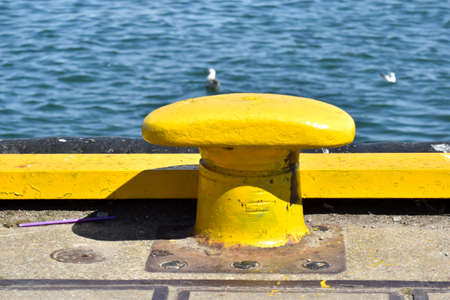 Yellow metal bollards by a dock