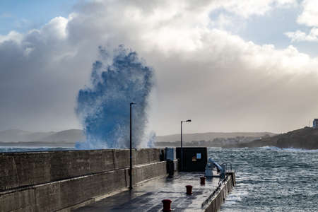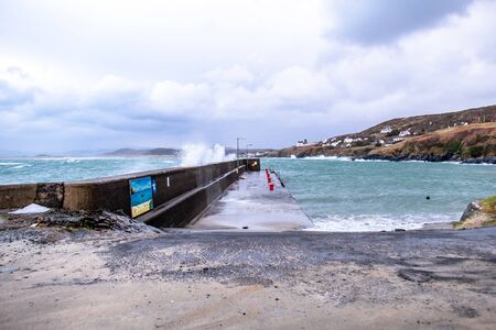 Portnoo, County Donegal / Ireland - February 10 2020 : Waves crashing into the harbour during storm Ciara