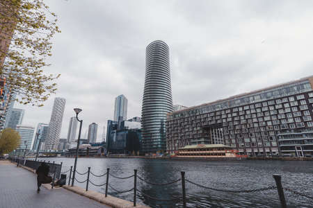 Canary Wharf, London | UK - 2021.05.08: The view of the Millwall Inner Dock at the Isle of Dogs
