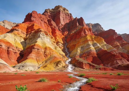 A winding stream flows through a canyon with colorful rock formations in Zhangye Danxia Landform Geological Park, China