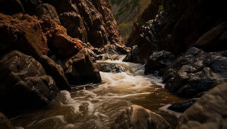 AI Generated. a narrow canyon with a river running through it