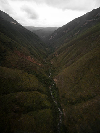 Panorama view of massive green canyon river gorge hills mountains Kuelap cable car Chachapoyas Amazon Northern Peru