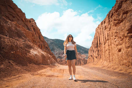 Wide angle view of a caucasian woman walking and holding her mobile phone on a mountain road. Horizontal. With copy space.
