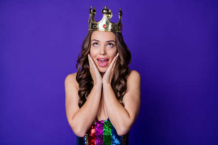 Photo of funny lady prom arms cheekbones open mouth look up tiara wear sequins dress isolated purple color background