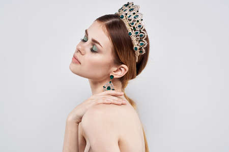 portrait of a woman luxury naked shoulders cosmetics fashion light background