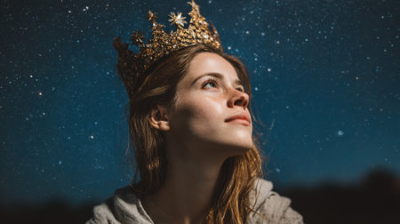 A young woman with long hair looks up at a beautiful star-filled night sky. She wears a golden crown and has a thoughtful expression surrounded by a serene atmosphere.