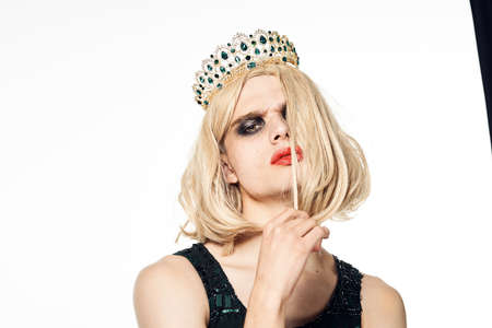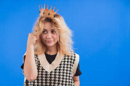 Indoor portrait of pretty blond-haired caucasian woman wearing funny fake crown over blue background. Isolated studio shot. High quality photo