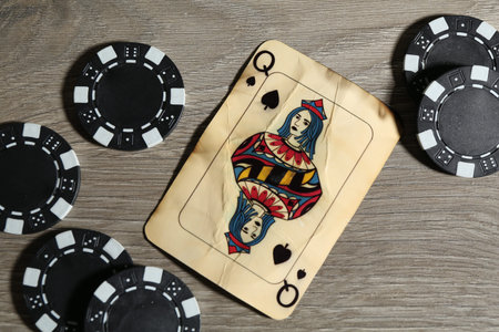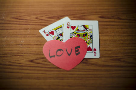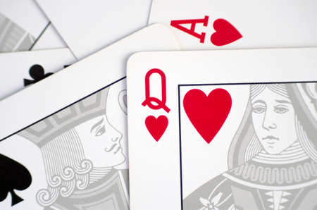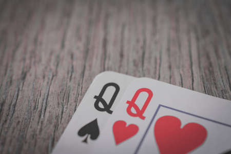 Playing cards close up, isolated on wooden table. Casino concept, risk, chance, good luck or gambling.