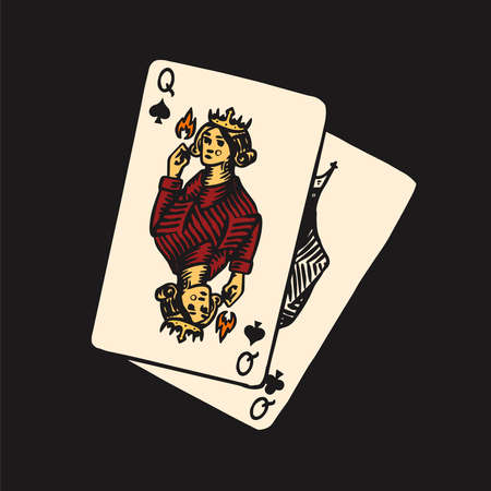 Playing cards in vintage doodle style. Spades Queen. Hand drawn engraved doodle sketch. Vector illustration for tattoo or t-shirt.