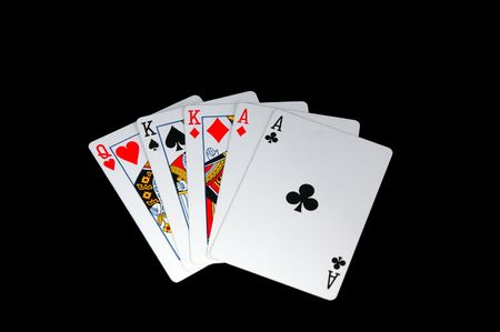 A close up of fanned out royal flush suit of five casino playing cards on a dimly lit background - 3D render