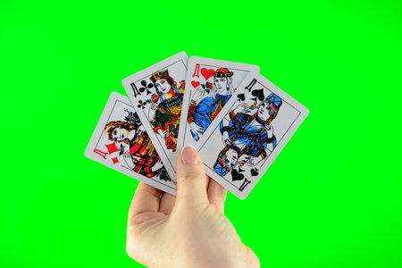 The player hands hold playing cards with a winning combination of royal flush. success at poker