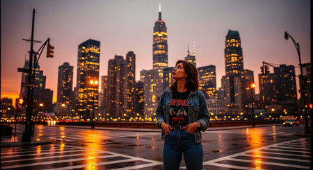 A woman standing in the foreground of a city skyline at dusk, wearing a graphic t-shirt and denim jacket, with skyscrapers illuminated in the background
