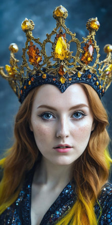 Stunning fantasy portrait of a queen with striking red and yellow hair and a dark crown. Ideal for fantasy, gothic, and beauty concepts.