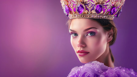 Elegant queen wearing a stunning jeweled crown with a purple background, exuding grace and royal charm