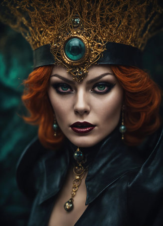A striking image of a woman with vibrant red hair wearing a regal crown. Perfect for illustrating power, beauty, and royalty. Ideal for use in fashion, fantasy, or lifestyle-themed projects.