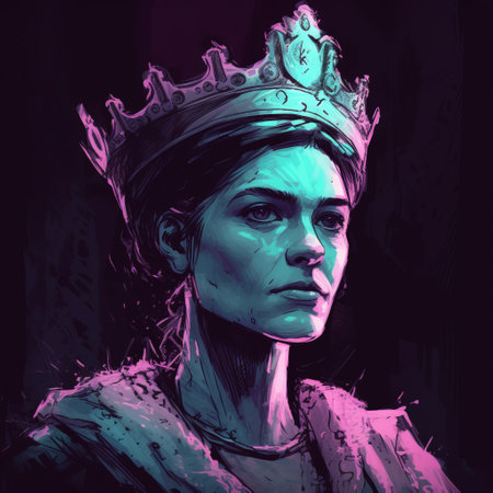 young 13th-century countess with bright white eyes, wearing a crown, captured in a head-on medium shot. the character portrait showcases a medieval fantasy setting with a unique blend of black, magenta, white, and cyan coloring. the background features a cyan and black design, while the artwork is created using pen and ink, reflecting a sludge metal punk style. ai generated