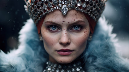 An angry and gloomy woman confidently poses in a leopard fur coat with a yellow crown, embodying strength and style