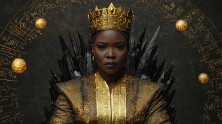 AI Generated. Blonde queen wearing gold crown sitting on throne posing