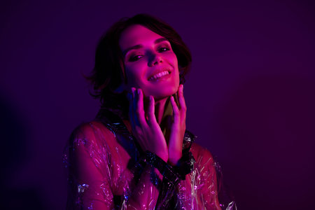 Photo of pretty lovely girl touch enjoy dry skin wear waterproof hood jacket over gradient background