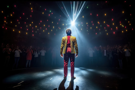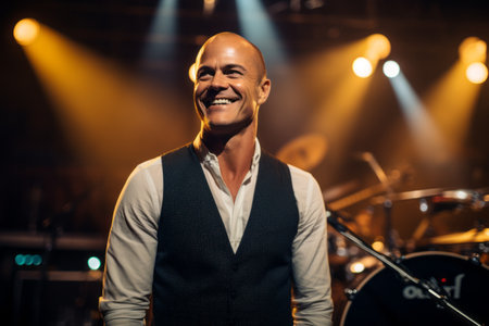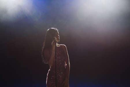 Singer on scene in the club. Bright stage lighting.