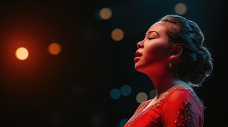 Portrait of beautiful singing woman on dark background.