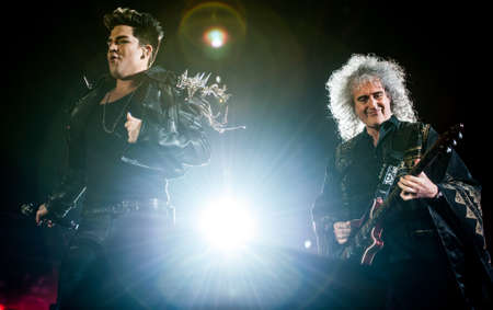 KYIV, UKRAINE - JUNE 30, 2012: Queen with Adam Lambert perform onstage during charity Anti-AIDS concert at the Independence Square on June 30, 2012 in Kyiv, Ukraine