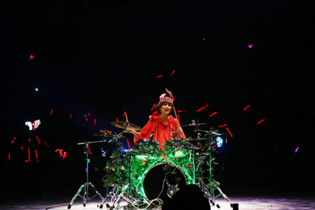 A female metal drummer with long hair holding up drumsticks behind the drumkit against a dark background