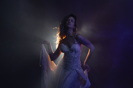 Mystical dancer in flowing white dress, illuminated by cinematic backlight in dark space