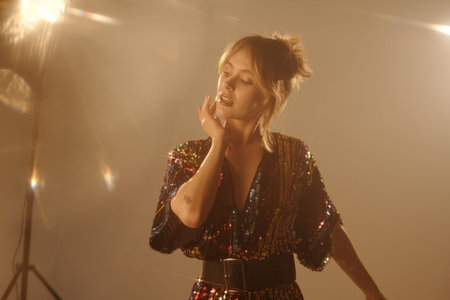 Waist up portrait of young woman performing under dramatic lighting during music video shoot in studio