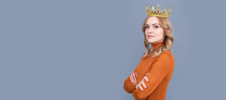self confident blonde girl with curly hair wear crown, confidence. Woman portrait, isolated header banner with copy space.