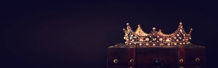 low key image of beautiful queen/king crown over wooden table. vintage filtered. fantasy medieval period