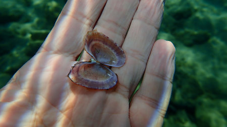 Seashell of bivalve mollusc flat sunsetclam or large sunsetclam, large sunset shell (Gari depressa) close-up on the hand of a diver undersea, Aegean Sea, Greece, Halkidiki