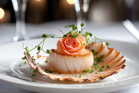 Seafood scallops with rose and thyme on white plate