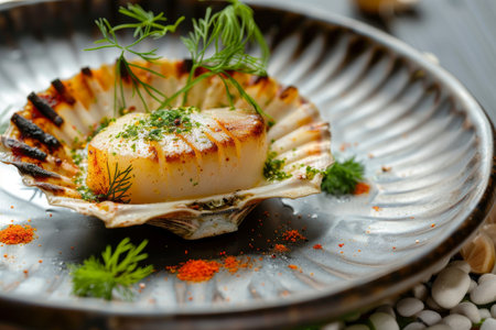 Baked Scallop in Scallops Shell, Gourmet Seafood, Exquisitely Served Mussel on Sea Pebbles Closeup, Generative AI Illustration