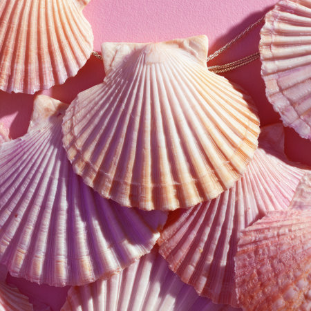 A collection of various scallop shells arranged artfully on a pink surface.