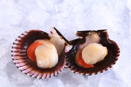 Raw queen scallops (lat. Aequipecten opercularis) on ice (Selective Focus, Focus the front of the scallop's meat)