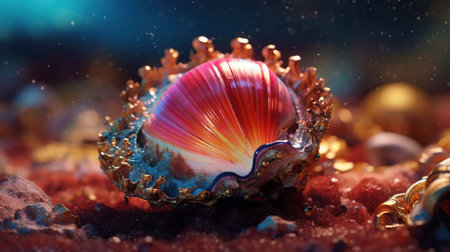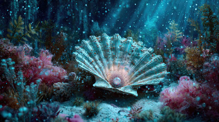 An open seashell rests on the ocean floor, surrounded by vibrant coral and aquatic plants. The composition features a blue and teal color palette with highlights creating a dynamic underwater scene. This image could be used for illustrating articles about marine life, environmental topics, or commercial designs.