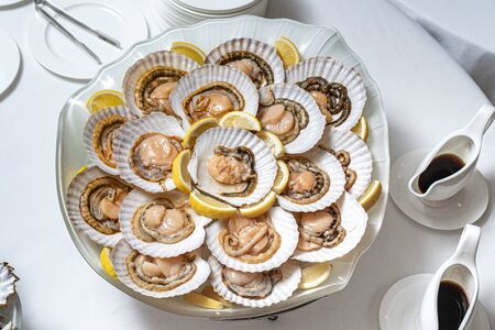 fresh shell scallop on wood board