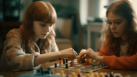 Chess tournament, kids and adults participate in chess match game outdoors in indoor hall, players of all ages play, competition in chess school club with chessboards on a table