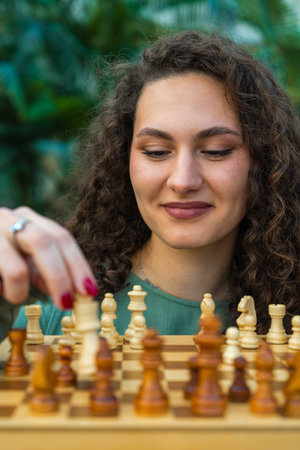 Woman playing chess with hair blowing in wind on couch in natural light setting