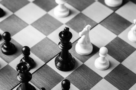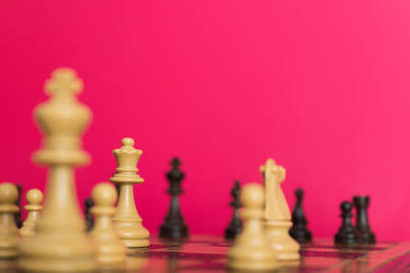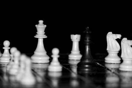 Chess game. White and black pieces are fighting for victory. The Central figure is in focus. The concept of teamwork.