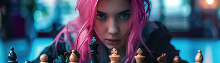 Young woman in blue polo shirt showing an expressive gesture while playing chess on a pink studio background