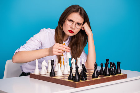 Tired woman moving chess pieces on a game board while seated against a solid blue background