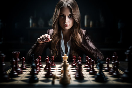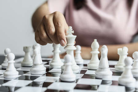 Hand of businesswoman moving, chess in competition shows leadership, followers, and business success strategies.