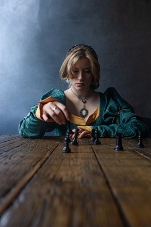 A beautiful young woman in a medieval-style green dress puts chess pieces on the table, the concept of palace intrigues