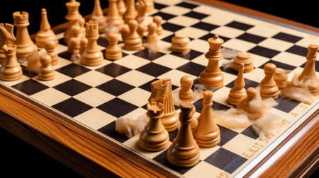 Burnt charred chess pieces in the dark. Selective focus. Incorrect composition to create anxiety and tension in the artistic design.