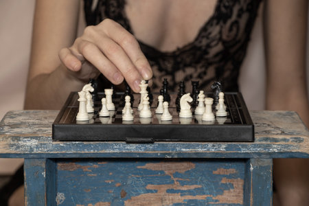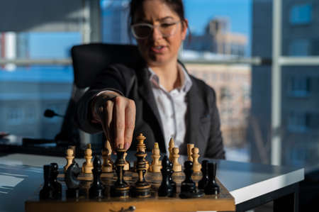 Business woman in a suit plays chess. Close-up of a female hand on a pawn