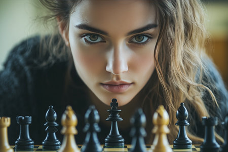 Close up face of a young girl, seen through a chessboard, as she holds a chess piece in her hands, reflecting focus, strategy, and concentration in a chess game.